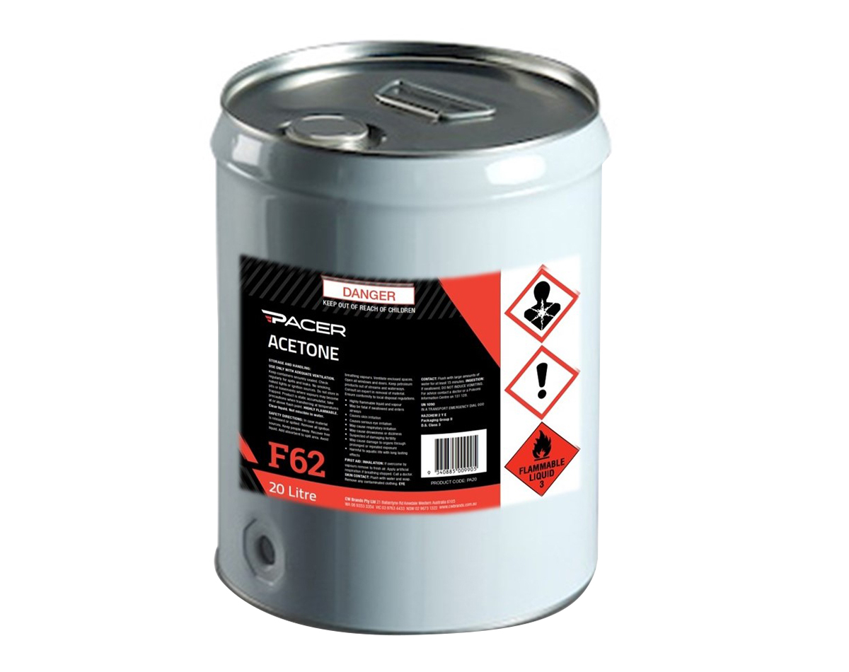 Pacer F62 Acetone has many including surface cleaner, glue remover and fibreglass repair solvent. It can also be used to clean equipment previously used with solvent based paints and also used as a glue remover and surface cleaner prior to application of sealants. Ideal for use with fibreglass resin & automotive body fillers. Can be used on porcelain, glass, ceramics, blank metals, and more. We recommend testing on a small area prior to application to determine suitability as certain plastics and lacquered and other sensitive surfaces may be damaged.
