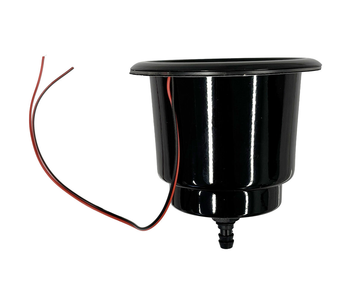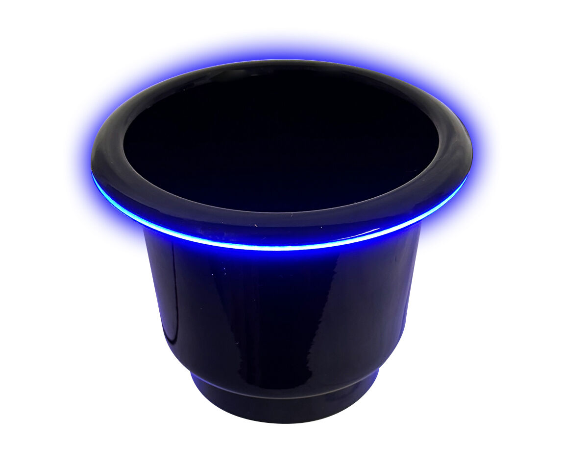 This large drink holder is crafted from 304-grade stainless steel, and features integrated blue LED underlighting.