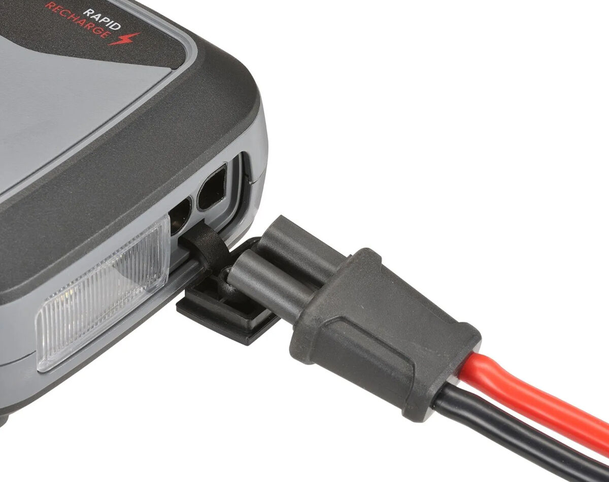 The Lithium Iron Phosphate (LiFePO4) battery can rapidly recover charge from the vehicle’s alternator following a successful jumpstart. Leaving the clamps connected to the vehicle’s battery for 40 seconds will recharge the Jump starter to 100% of the original charge status. Once the Jump starter is fully charged, the RRT will shut off avoiding overcharging.