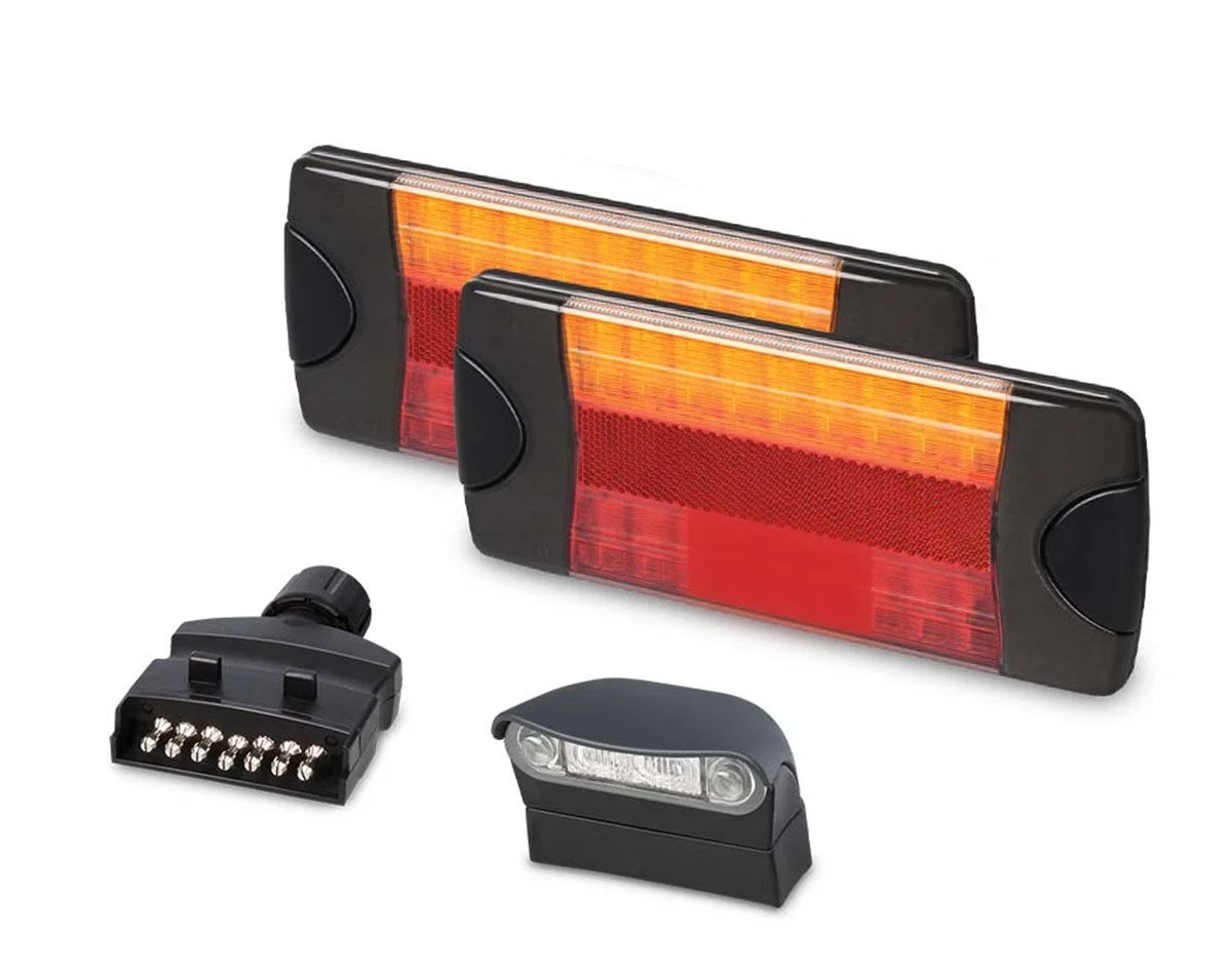 This complete kit includes 2x Combi LED lamps, 1x number plate lamp and 1x 7-pin flat trailer plug.