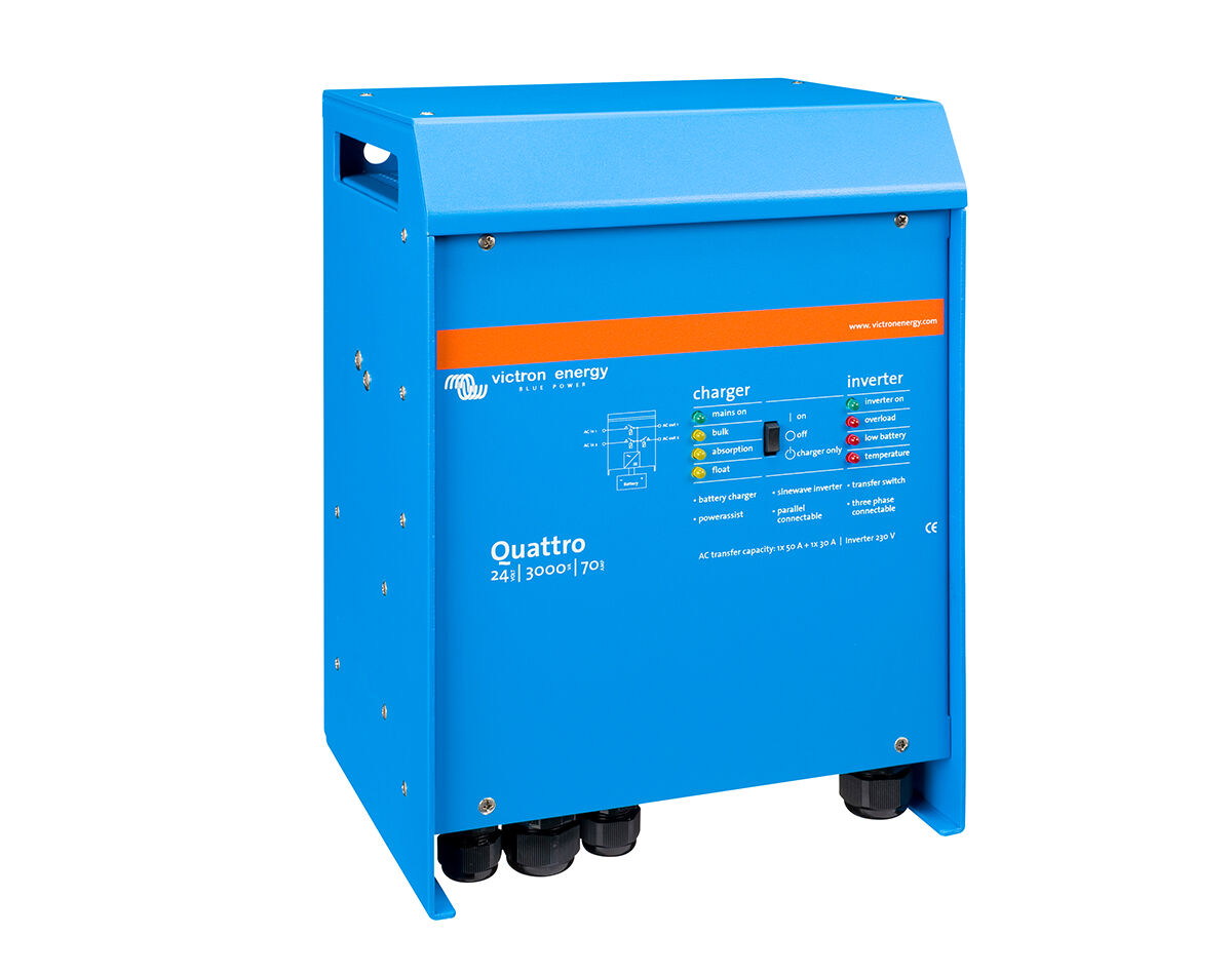 Similar to the MultiPlus, the Quattro is also a combined inverter and charger. Additionally it can accept two AC inputs and automatically connect to the active source. Its many features include a true sine wave inverter, adaptive charging, hybrid PowerAssist technology plus multiple system integration features such as three or split phase operation and parallel operation.